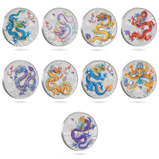 2024 Perth Mint Lunar Dragon 1oz Silver Coloured Coin in Card - All 9 Cards