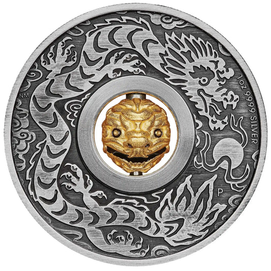 2024 Perth Mint Lunar Dragon 1oz Antiqued Silver Rotating Charm Coin