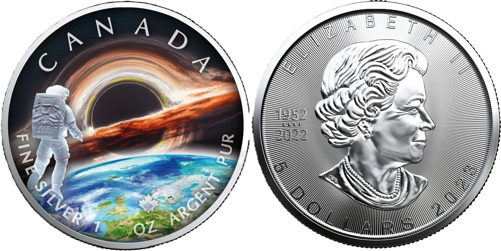 2023 Earth – The Universe 1 oz Silver Maple Leaf Coin is a colour-enhanced collectible struck on the 1 oz Canadian Silver Maple Leaf bullion coin. This special edition is part of The Universe series and highlights planet Earth against a cosmic backdrop with an astronaut and space imagery. While based on the official Royal Canadian Mint (RCM) Silver Maple Leaf, this specific version has been colourized/embellished by an authorised third-party mint (this means it is no longer considered legal tender under its altered surface).