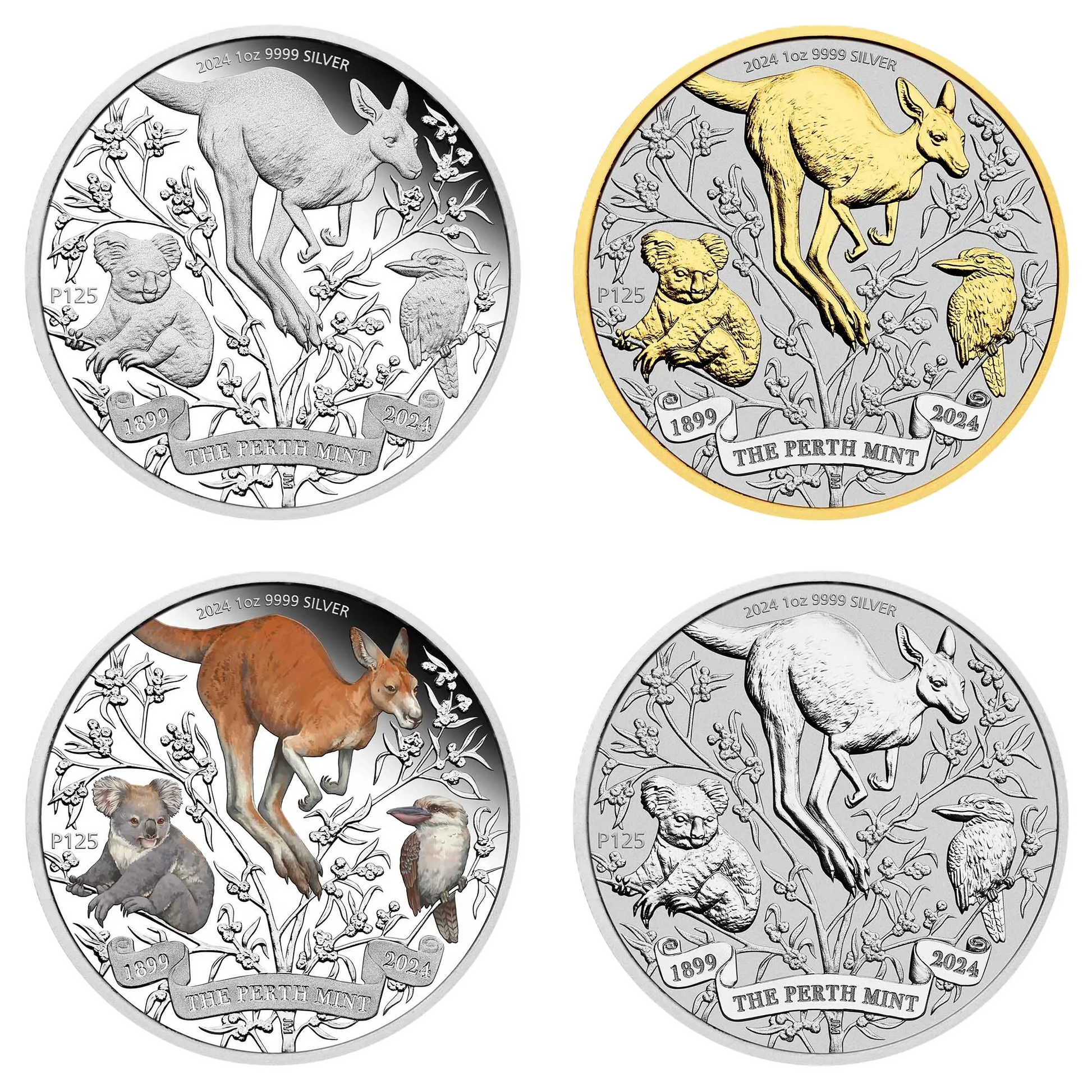 The anniversary design showcases some of the Mint’s most iconic contemporary themes, featuring the kangaroo, kookaburra, and koala set among Australia’s national floral emblem, golden wattle. Completing the design is the commemorative inscription ‘1899 THE PERTH MINT 2024’ within a scroll, along with a special ‘P125’ anniversary mintmark.