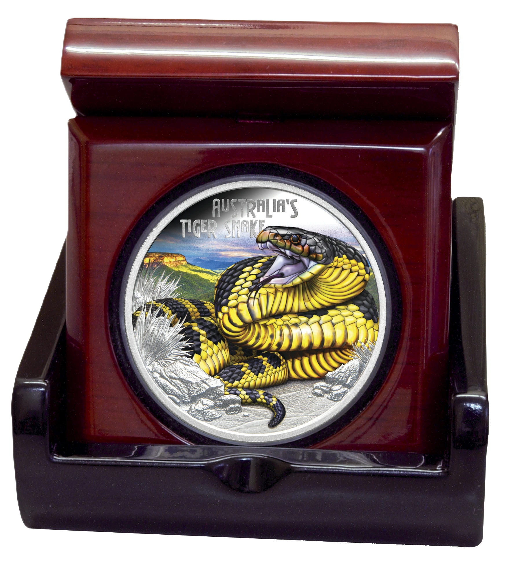 The reverse features a fully struck-up Tiger Snake poised in striking detail, enhanced with rich full-colour minting to capture the serpent’s vivid hues. The obverse includes the effigy of His Majesty King Charles III.