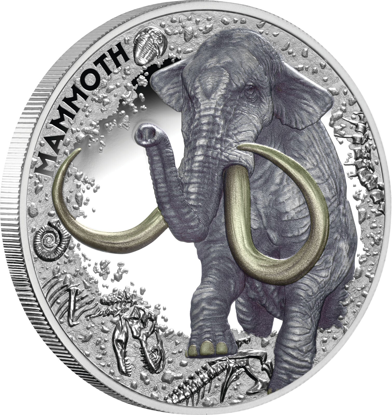 The expansive crown-sized 38.60mm flan forms the perfect canvas for this ancient giant, while a decorative border of Ice Age fossils provides an elegant finishing touch.