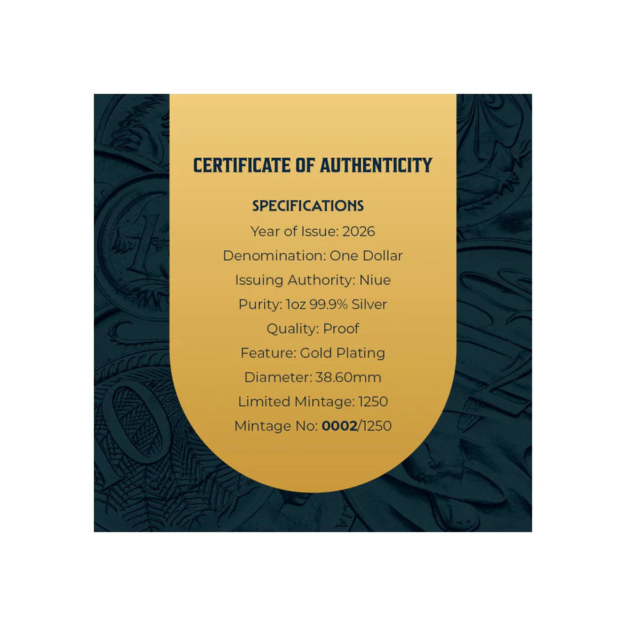 Issued in 2026 and struck to impeccable Proof quality from 1oz of 99.9% pure silver, this stunning coin is enhanced with exquisite 24-carat gold-plating, uniting two of the world’s most cherished precious metals in one superb collectible.