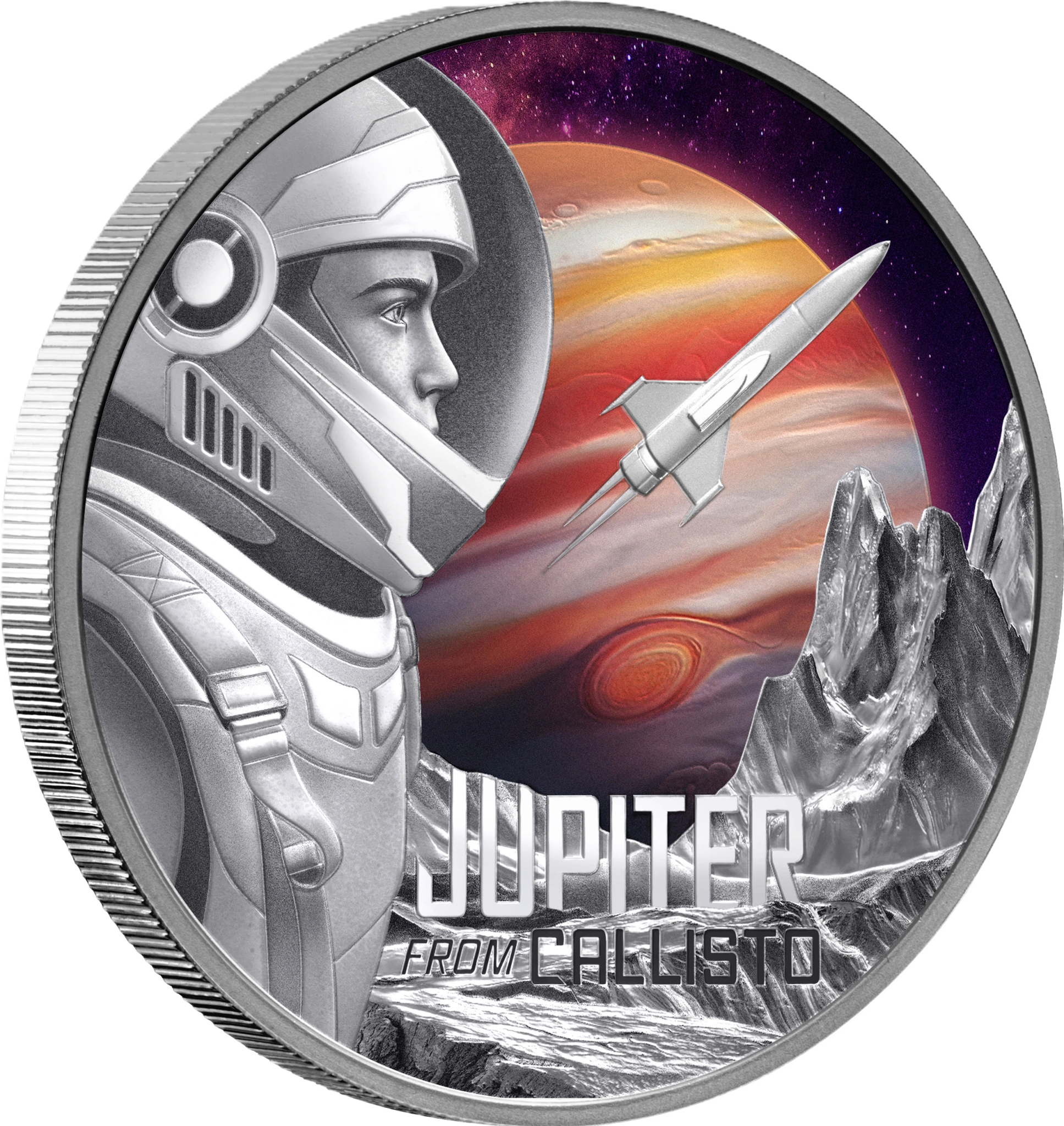 Discovered by Galileo in 1610, Callisto is Jupiter’s second-largest moon and the third-largest moon in the entire Solar System. The coin’s stunning full-colour design depicts: