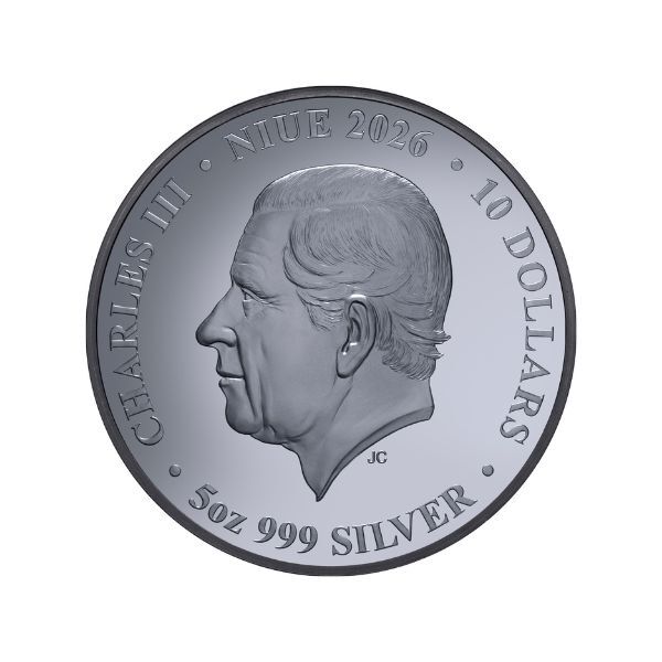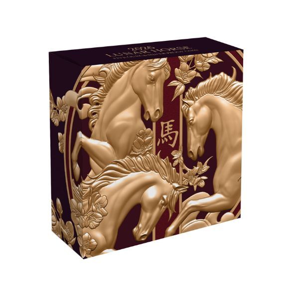 A stunning synthesis of flawless quality, imposing dimensions, numismatic artistry and limited availability, Downies is proud to present the Lunar Year of the Horse 2026 $10 Gold-plated 5oz Silver Black Proof Coin!